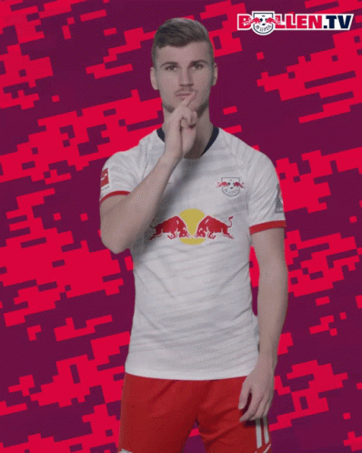 Timo Werner of RB Leipzig points to the camera, acknowledging a good job.