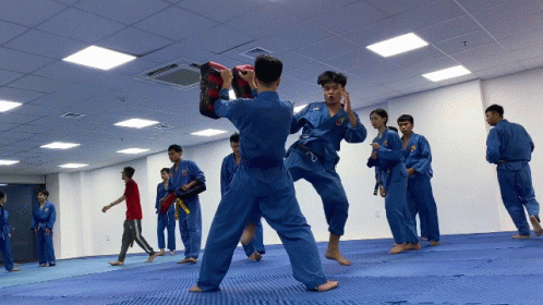 Young practitioners of the Greenwich Vovinam Club train in martial arts, practicing kicks and punches in a gym.