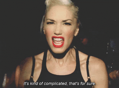 Gwen Stefani passionately delivers the line 'It's kind of complicated, that's for sure' with an intense expression.