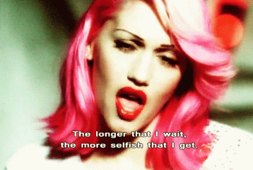 Gwen Stefani with vibrant pink hair delivers a powerful lyric: 'The longer that I wait, the more selfish that I get.'