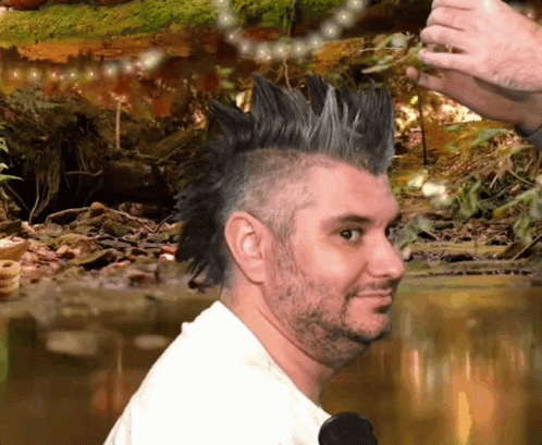 Ethan Klein of H3 Podcast gets his impressive mohawk measured with a spirit level in a forest setting.