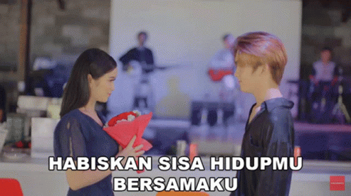 A romantic scene featuring a woman proposing to a man with flowers, set to the song 'Habiskan Sisa Hidupmu Bersamaku' by Trayen.