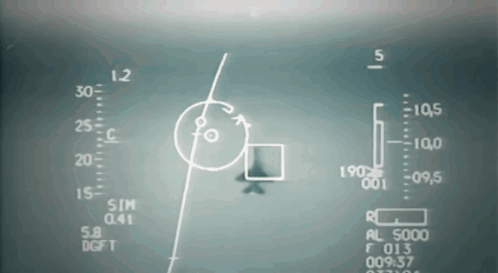 F-16 Head-Up Display (HUD) showing a gun track simulation with various flight data and targeting reticle.