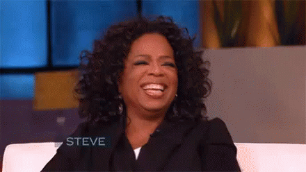 Oprah Winfrey laughing and smiling joyfully in a studio setting, wearing a black blazer.
