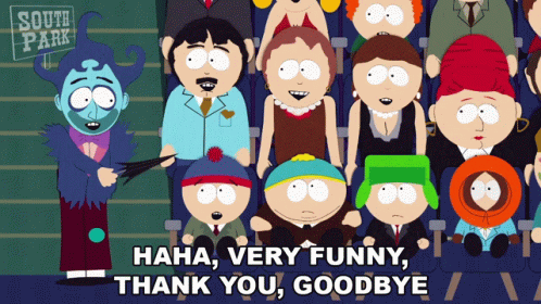 A sarcastic character in South Park delivers a dismissive 'Haha Very Funny, Thank You, Goodbye' to Stan Marsh and friends.