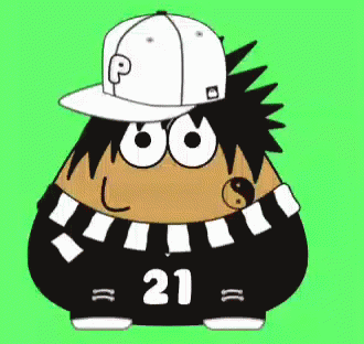 Animated Pou character in a white hat and black shirt yawns, then smiles, on a green background.