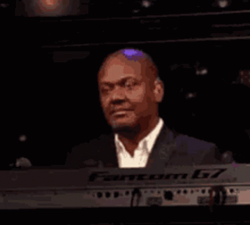 A man in a suit and white shirt chuckles while sitting at a Roland Fantom G7 keyboard.