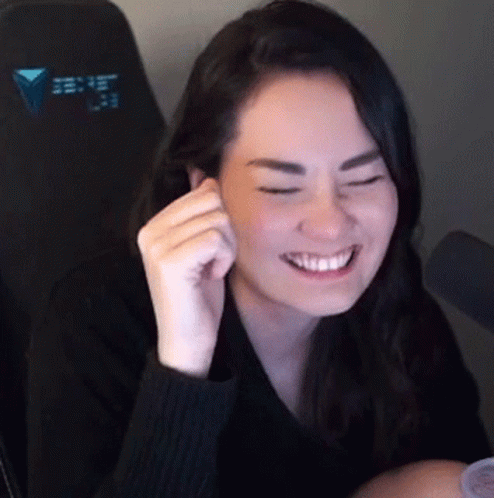 Pathra laughing heartily while sitting in her gaming chair, a moment of pure joy.