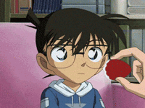 Haibara Ai feeds Conan Edogawa a strawberry, making him happy and surprised in this anime clip.