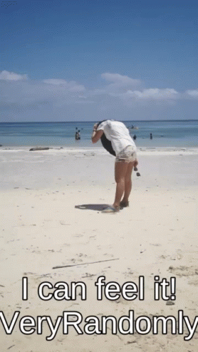 Woman with long hair doing a dramatic hair flip on a sunny beach, feeling the moment with the on-screen text 'I can feel it! VeryRandomly'.