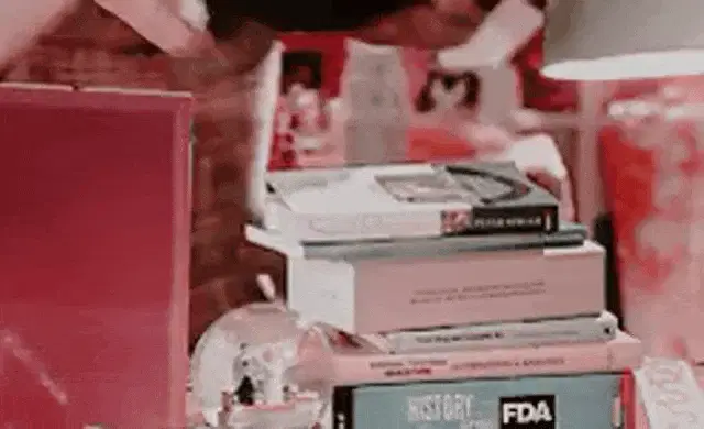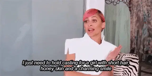 A woman with long, wavy hair performs a confident and stylish hair flip in a kitchen setting.