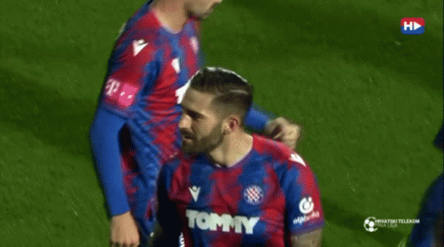Marko Livaja of Hajduk Split celebrates with teammates after a match, showing camaraderie and team spirit.