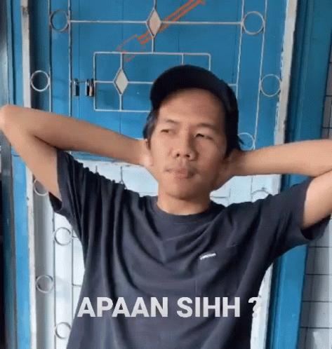 Hakifikri looks confused, standing in front of a blue door with hands behind his head, asking 'Apaan Sihh?'