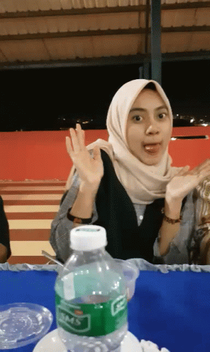 Hakifikri Junjacob, a woman in a hijab, playfully sticks her tongue out at a table.