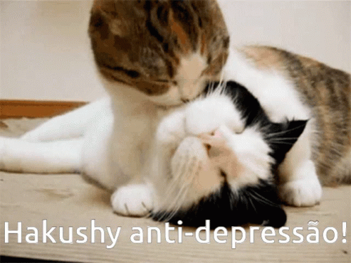 Two adorable cats, Hakushy and Sagusky, cuddle with a message of anti-depression.