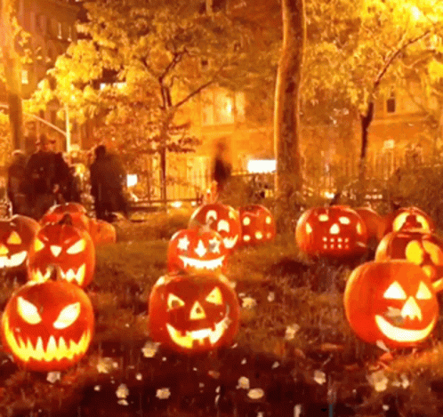Glowing jack-o'-lanterns illuminate a park at night, surrounded by falling leaves, creating a festive Halloween atmosphere.