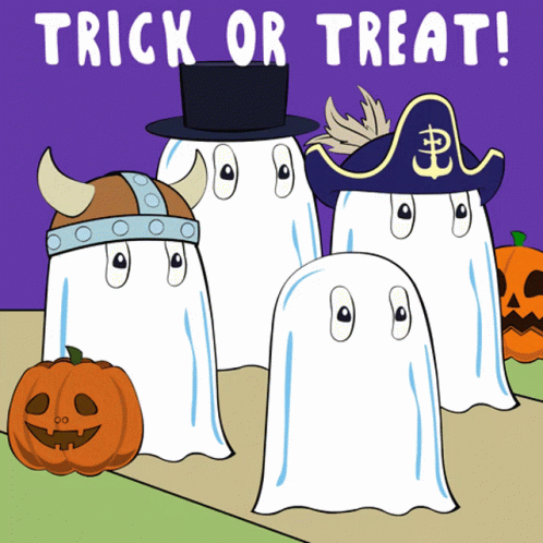 Cartoon ghosts in various costumes with pumpkins, ready for Trick or Treat on Halloween.