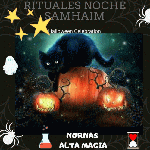 A black cat on a pumpkin for a Halloween/Samhain celebration, with "Rituales Noche Samhaim" and "Nornas Alta Magia" text.