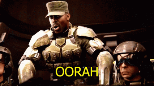 A man in military uniform shouts "OORAH" in a scene from Halo 2.