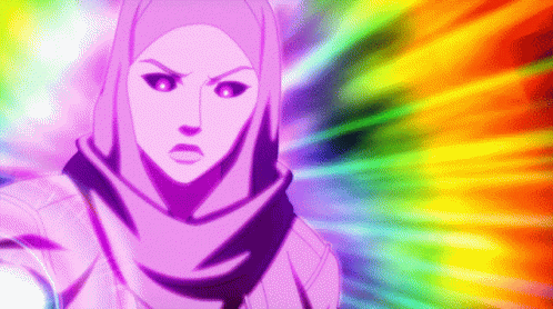 Halo from Young Justice, in a purple hijab, unleashes a powerful energy beam with glowing eyes.
