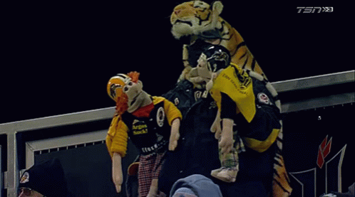 Hamilton Tiger-Cats puppets displayed, including a tiger mascot and two player puppets at a CFL event.