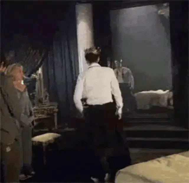 Hamlet from Rosencrantz And Guildenstern Are Dead clucking to a chicken on the floor.