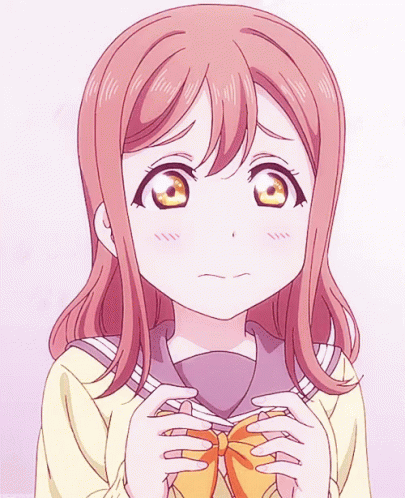 Hanamaru Kunikida from Love Live! Aqours looks emotional, with tears in her eyes and hands clasped.
