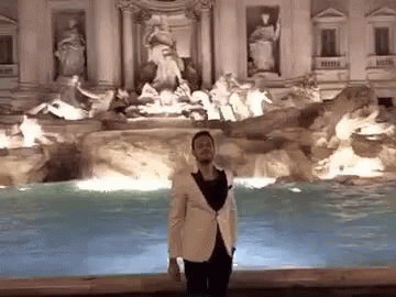 A handsome man, referred to as a 'prince', poses elegantly in front of the illuminated Trevi Fountain in Rome.