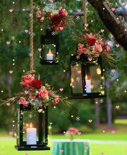 Decorative lanterns with lit candles and fresh flowers hang from a tree branch in a lush garden setting.