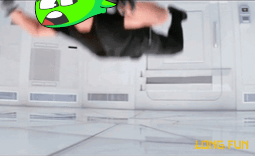 Long Dragon cartoon character parodies Mission Impossible, hanging from the ceiling in a white room.