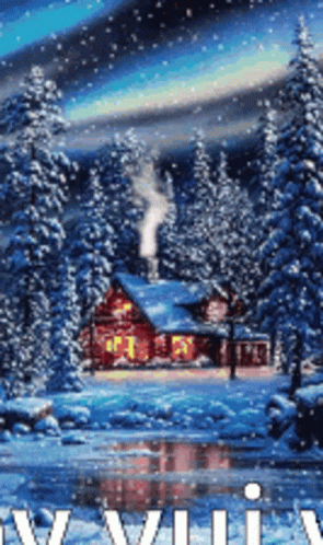 A serene Hanh Phuc winter scene featuring a cozy cabin nestled among snow-covered trees by a tranquil river.