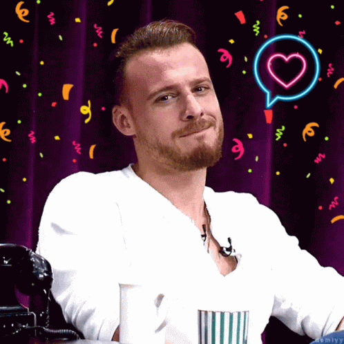 Kerem Bursin smiling in a studio setting with a purple curtain and confetti.