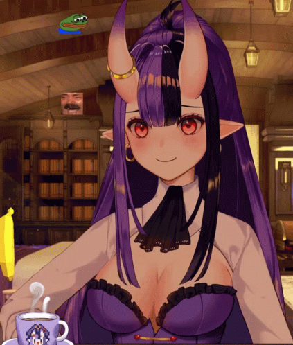 a girl with horns is sitting at a table next to a cup of coffee