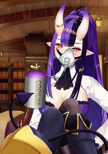 a woman with horns is wearing an oxygen mask and holding a container that says copium