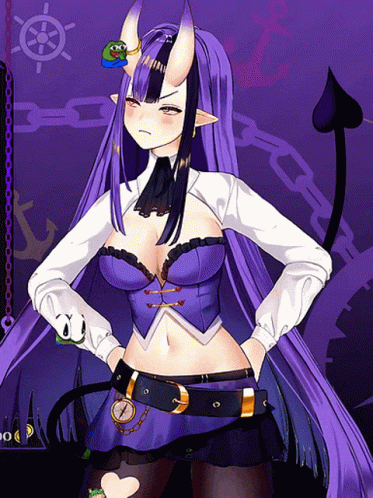a girl with purple hair and horns is standing with her hands on her hips in front of a purple background