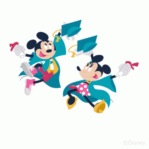 Mickey Mouse and Minnie Mouse in graduation caps and gowns celebrate their achievement with 'WE DID IT!' at HK Disneyland.