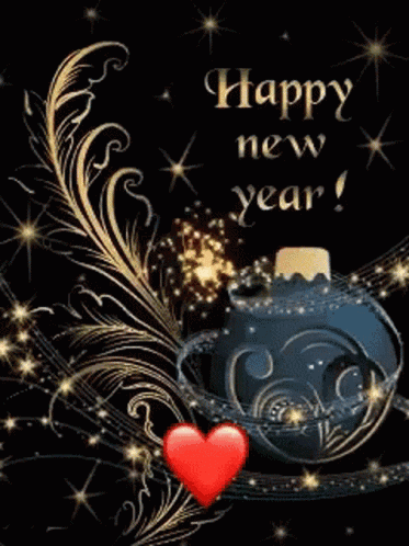 Festive Happy New Year greeting with sparkling fireworks, a decorative ornament, and a red heart.