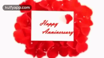 A beautiful 'Happy Anniversary' card surrounded by vibrant red rose petals, perfect for celebrations.