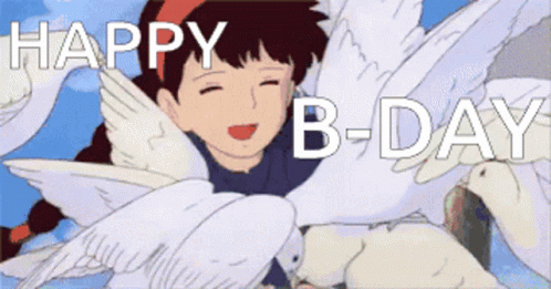 An animated Studio Ghibli-style girl smiles happily, surrounded by white doves, with a 'Happy B-Day' message.