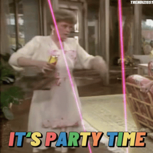 Energetic woman dancing to celebrate a birthday, with 'It's Party Time' text on screen.