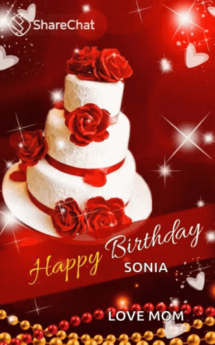 Happy Birthday wish for Sonia from Mom, featuring a beautiful cake with red roses and sparkling hearts.