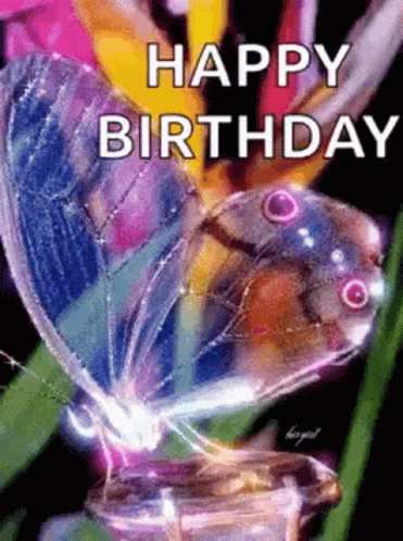 A sparkling butterfly with colorful wings sits on a flower, wishing a happy birthday.