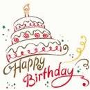 An animated drawing of a tiered birthday cake with a lit candle and 'Happy Birthday' text.