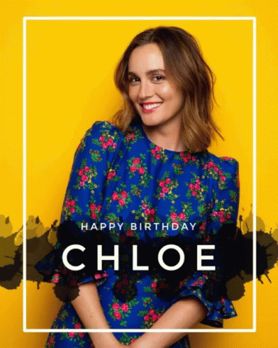 Chloe in a blue floral dress smiles against a vibrant yellow background with a 'Happy Birthday' message.