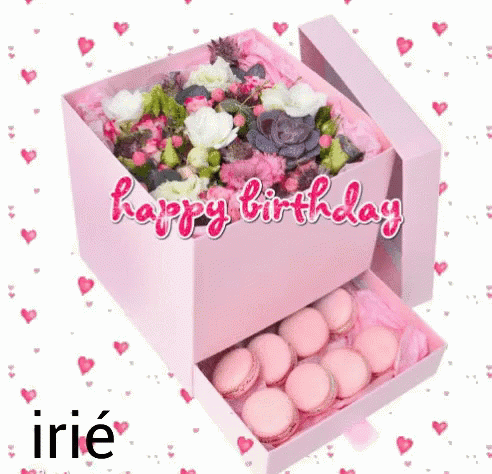 A beautiful pink gift box filled with flowers and macarons, wishing 'Happy Birthday irié'.