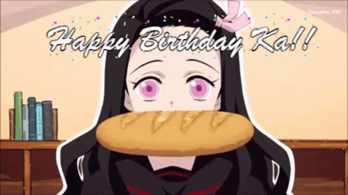 Anime girl with pink eyes holding a loaf of bread, celebrating Happy Birthday Ka!