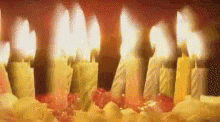 Flickering flames of numerous lit birthday candles on a cake, ready for a wish to be made.