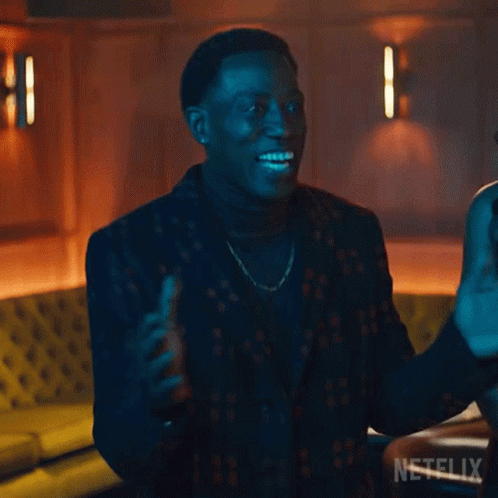 Wesley Snipes and Carlton share a joyful moment, laughing and clapping in a vibrant setting.