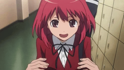 Toradora's Minorin (Minori Kushieda) looking happy and cheerful, clapping her hands in a school hallway.