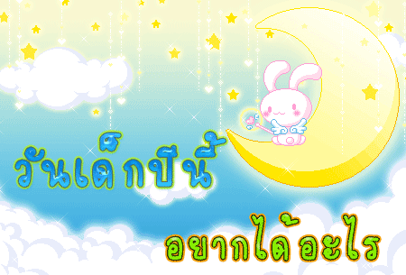 Cute bunny angel on a crescent moon with stars, asking 'What do you want?' for Children's Day.